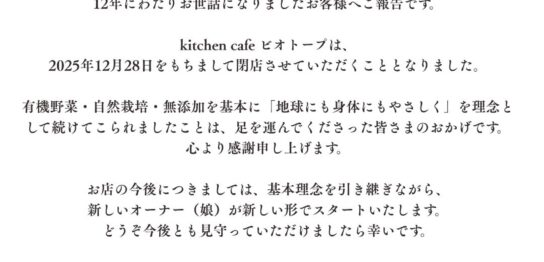 ビオトープ 引き継ぎのお知らせ ビオトープは 2025.12.28を持って ビオ